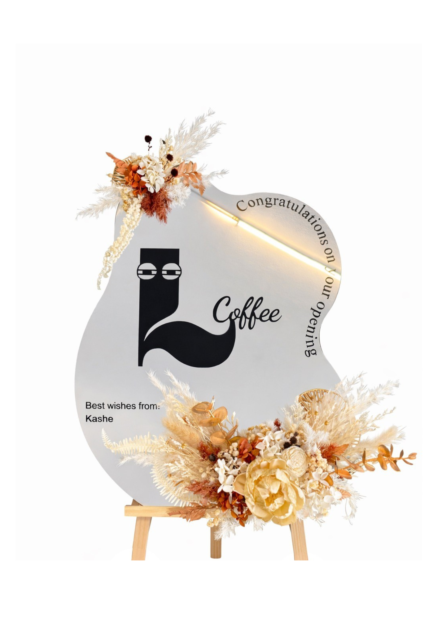 Grand Opening Flower Mirror Table Stand – Muji color features a modern mirror design and a refined arrangement of preserved florals. Designed for café and business openings, this mirror stand delivers a clean, professional, and premium presentation while enhancing brand visibility.